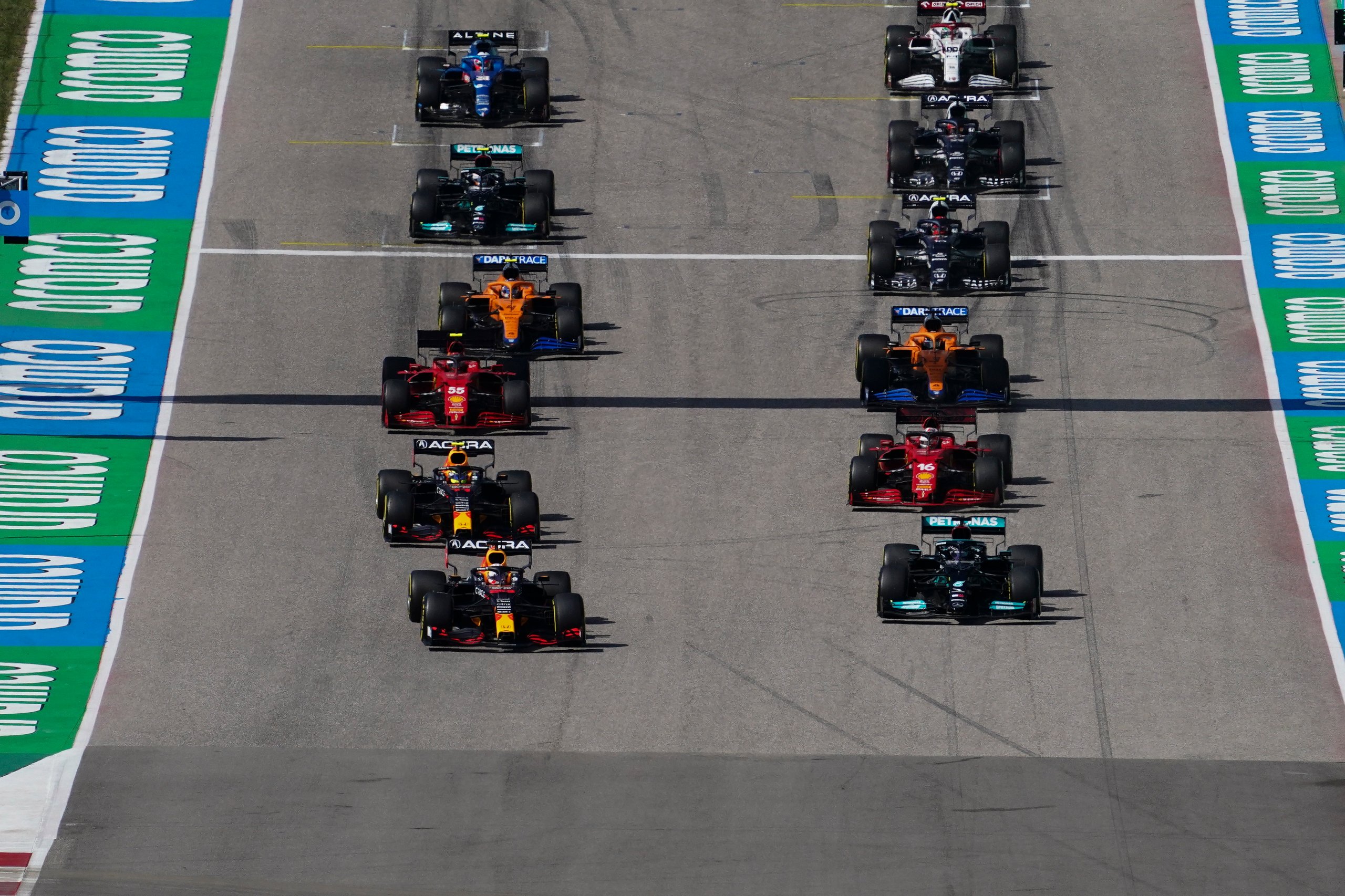 epa09544543 Dutch Formula One driver Max Verstappen (front L) of Red Bull Racing leads the pack next to British Formula One driver Lewis Hamilton of Mercedes-AMG Petronas (front R) at the start of the Formula One Grand Prix of the US at the Circuit of The Americas in Austin, Texas, USA, 24 October 2021. EPA/SHAWN THEW
