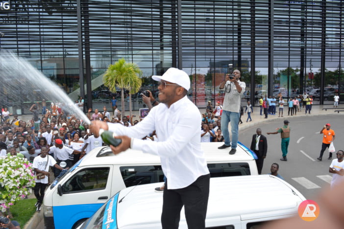 Dji Tafinha, não ficou indiferente e após constatar que a enchente justificou os esforços investidos na preparação do álbum, o cantor ficou por cima de um carro e abriu “champanhe” tendo brindado com os fãs. O rapper teve a “santa” paciência de abraçar e dar beijinho às mulheres grávidas, bem antes de se sentar para dar início a sessão de autógrafos.