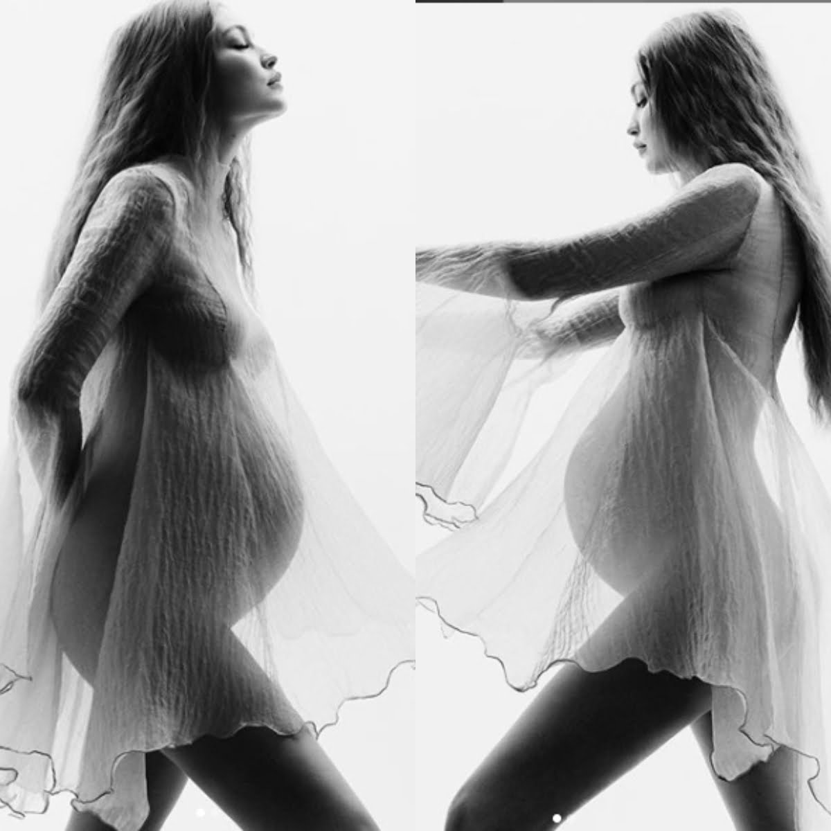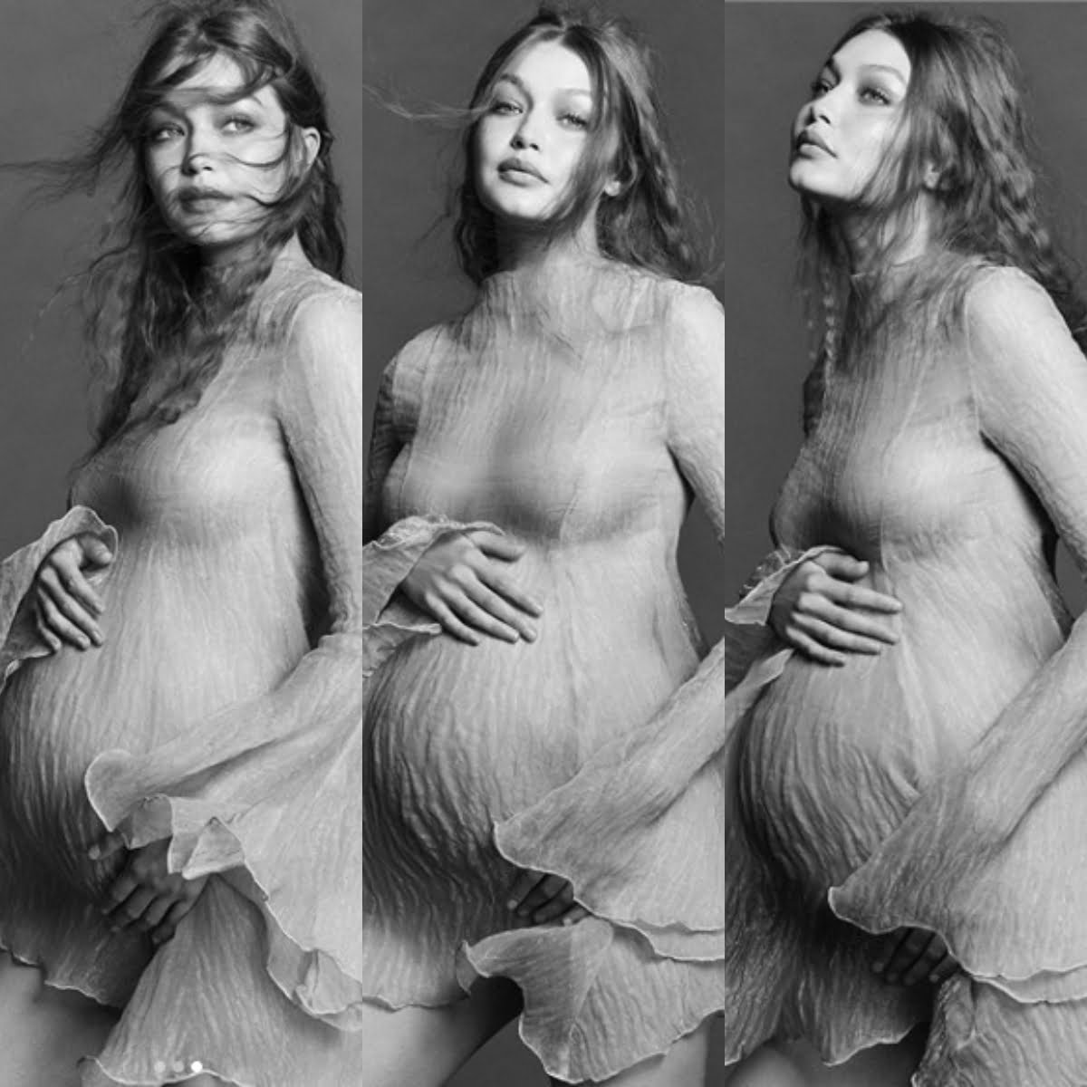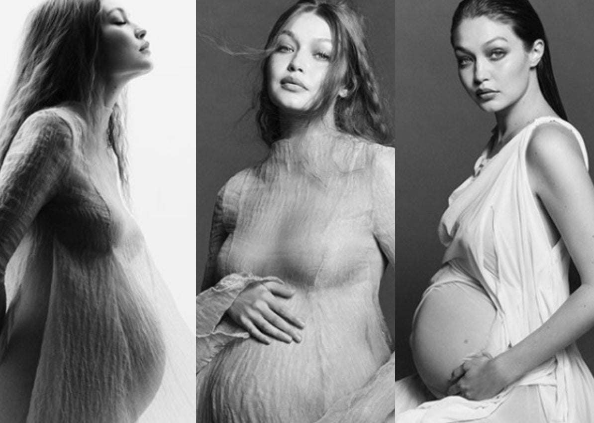 Nas demais fotografias, Gigi surge sem biquini sob um vestido curto, transparente de mangas longas e babadas e as com suas mãos na barriga. Em uma outra, a modelo aparece com as roupas toda ela branca e molhada, sentada sob os pés, tendo na legenda anunciado que está a crescer um anjo em seu ventre.