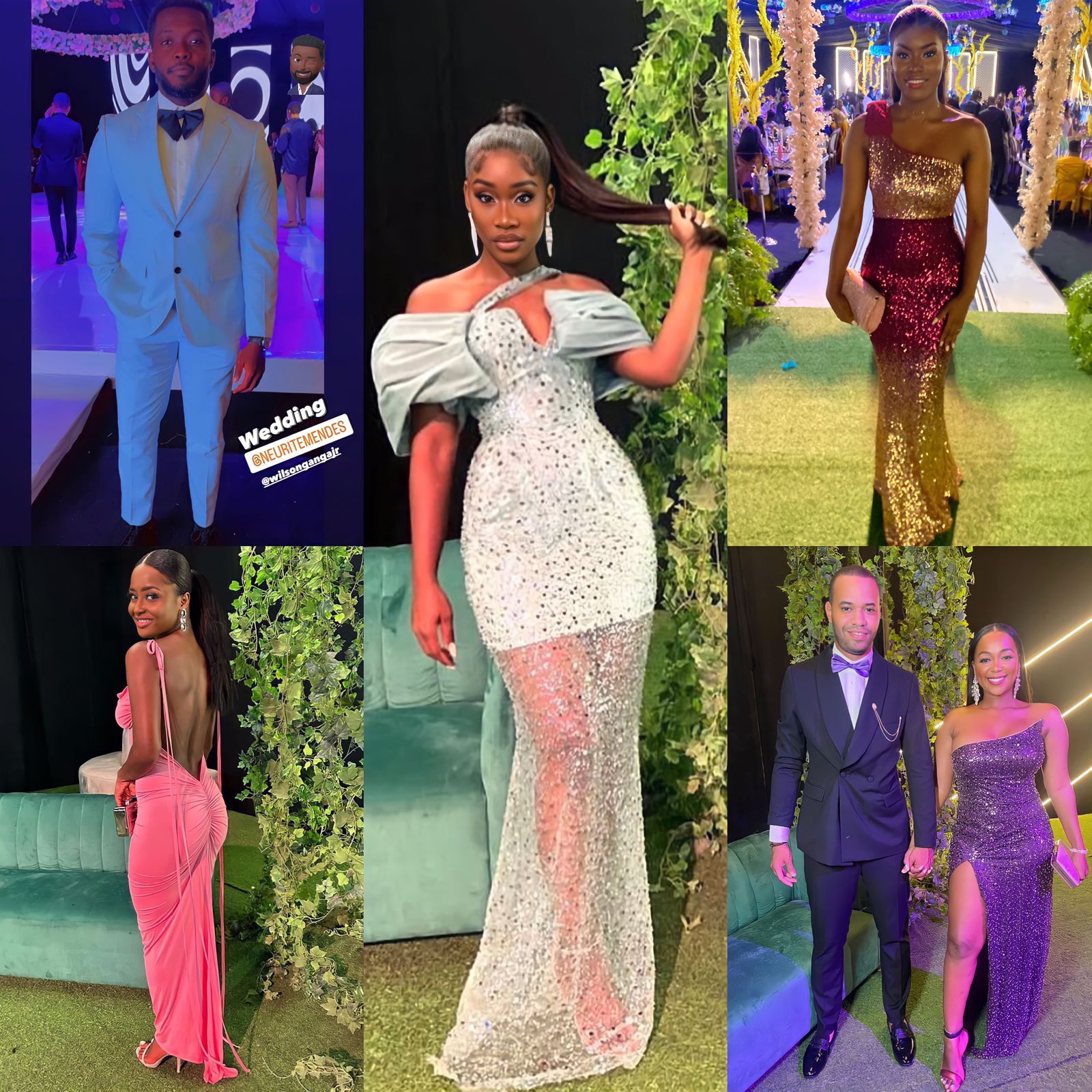 Dentre os vários vestidos longos, fatos e acessórios que deixaram em evidência a boa forma dos que marcaram presença no casamento para testemunhar a união e o amor do casal, algumas figuras angolanas se destacaram com os seus looks ousados e requintados, como é o caso de Hortêncio Bruno, Neu Afro Chick, Nataniela Simões, Henesse Cacoma e o casal Edivania do Carmo e Ivan Roberto. Veja os looks: