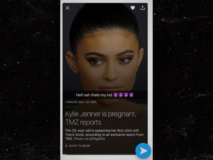 Em uma publicação no Snapchat, que já foi apagada, Tyga que teve um longo relacionamento com a socialite voltou a compartilhar um momento de Twitter “Kylie Jenner Is Pregnant” com uma legenda adicionada que diz: “Hell nah thats my kid”, seguido por quatro emojis do diabo roxo. Ele eliminou o post, mas não antes de ser capturado por uma captura de tela pelo TMZ.