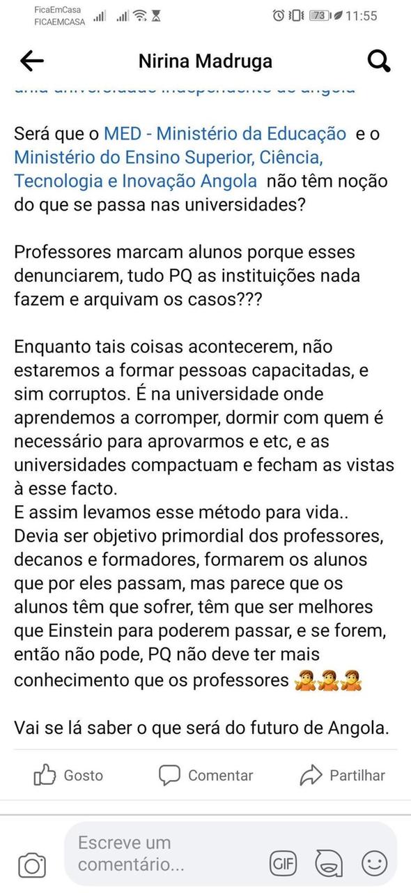 De acordo informações que a jovem enviou para redação do AngoRussia, após ter feito uma denúncia enquanto fazia frequência no primeiro ano do curso de Engenharia e Gestão Industrial, sobre a posição do professor quando o assunto são as suas notas, o professor a “marcou” e a instituição nada faz para resolver a situação, tendo esta dado o caso como arquivado.