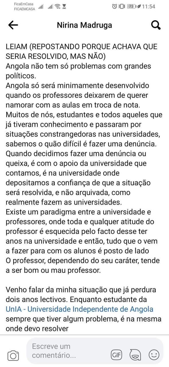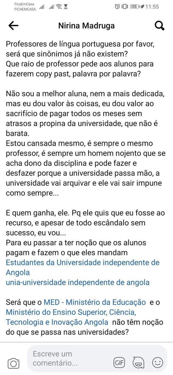 “Venho falar da minha situação que já perdura dois anos lectivos. Enquanto estudante da UnIA (Universidade Independente de Angola) sempre que tiver algum problema, é na mesma onde devo resolver. Tenho sido perseguida por um professor, cujo objetivo ainda não consigo perceber, mas que vem a dar-me notas injustas, sem um motivo aparentemente lógico”.